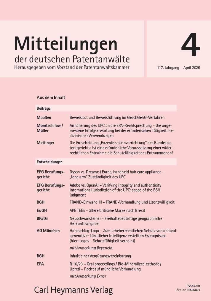 In der April-Ausgabe 2026 der Mitteilungen der deutschen Patentanwälte stellt Herr Dr. Meitinger die Entscheidung "Exzenterspannung" des Bundespatentgerichts vor.